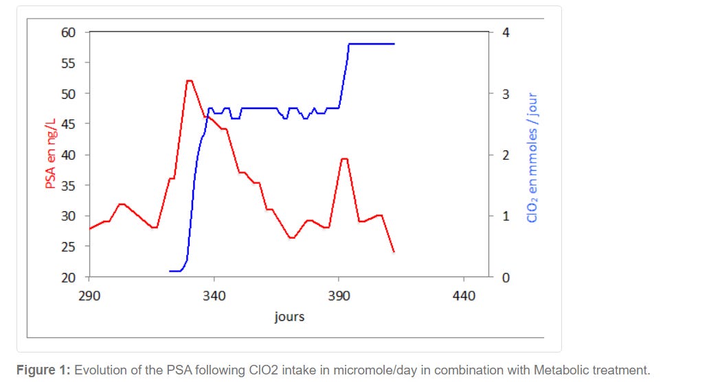 Another patient with hormone resistant metastatic prostate cancer has experienced a sharp drop in PSA level as well as improved medical condition. From extensive literature review, the mechanism of action of chlorine dioxide is unknown. It is our hypothesis (albeit unproven) that chlorine dioxide results in tumor cell acidification of the alkaline pH of cancer cells.