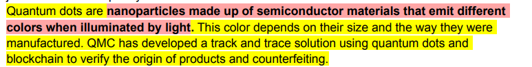 Quantum dots are nanoparticles made up of semiconductor materials that transmit various colors when illuminated by light. This color depends on their dimension and the way they were produced. QMC has built a track and trace solution utilizing quantum dots and blockchain to confirm the creation of products and counterfeiting.