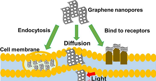 Two recent studies give us a less than rosy angle. In the first, a team of biologists, engineers and material scientists at Brown University examined graphene’s potential toxicity in human cells. They found that the jagged edges of graphene nanoparticles, super sharp and super strong, easily pierced through cell membranes in human lung, skin and immune cells, suggesting the potential to do serious damage in humans and other animals. (!!!!!!!!)