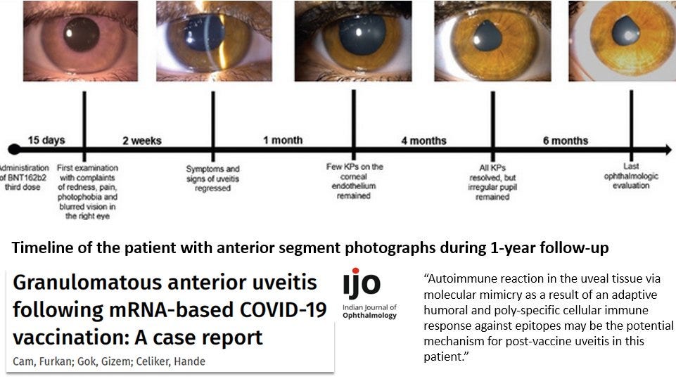 presented with complaints of redness, pain, photophobia, and blurred vision in the right eye 15 days after she received the third dose of BNT162b2 vaccination.