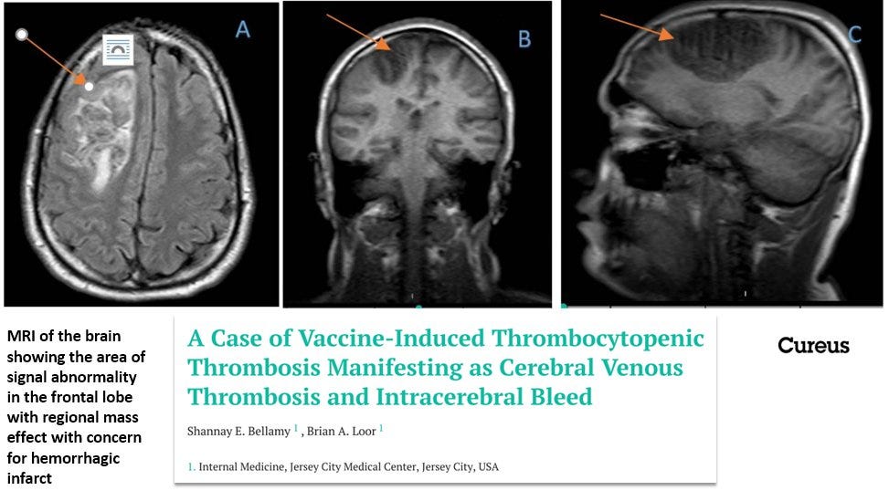 https://ncbi.nlm.nih.gov/pmc/articles/PMC9894637/ A Case of Vaccine-Induced Thrombocytopenic Thrombosis Manifesting as Cerebral Venous Thrombosis and Intracerebral Bleed
